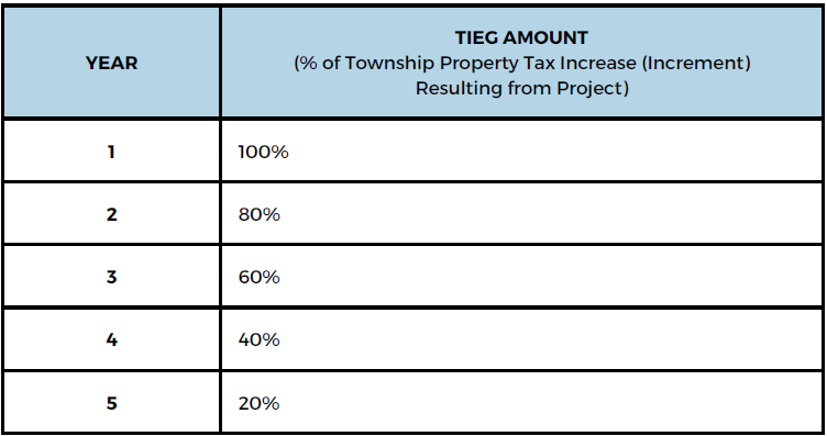 This program will provide an annual tax increment equivalent grant (TIEG) for five years after project completion equal to a percentage of the increase in the Township portion of property taxes as shown below generated by completion of a “substantial project” where the proposed and “as built” substantial project achieves the minimum evaluation