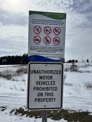 Residents must obey all signs posted around the ponds and not dispose of trash, leaves or grass clippings in and around the pond. As well, leisure activities are not permitted in stormwater management facilities as the water entering the ponds is untreated and the suitability of the water for swimming or ice for skating is not known and is not monitored. The Township does not take responsibility for the safety of persons who attempt to use the ponds for leisure activities.
